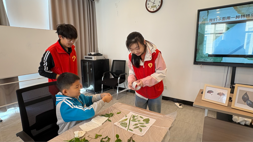 活动中,党员志愿者率先垂范,用通俗语言为小朋友讲解植物拓印的历史渊源与文化意义,随后手把手指导创作:从挑选纹理清晰的秋叶,到演示拓印工具用法、搭配色彩,全程耐心指导、细致协助,与孩子们共同完成一幅幅独具特色的树叶拓印作品。现场氛围热烈,孩子们专注创作、兴致盎然,在实践中感受自然之美与手工乐趣。活动尾声,志愿者有序清理场地并合影,展现良好风貌。