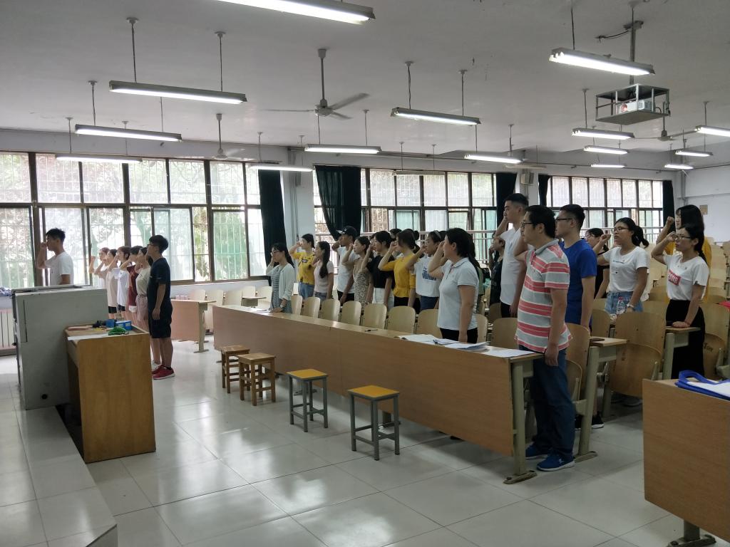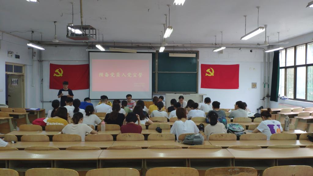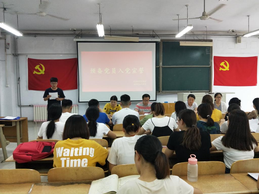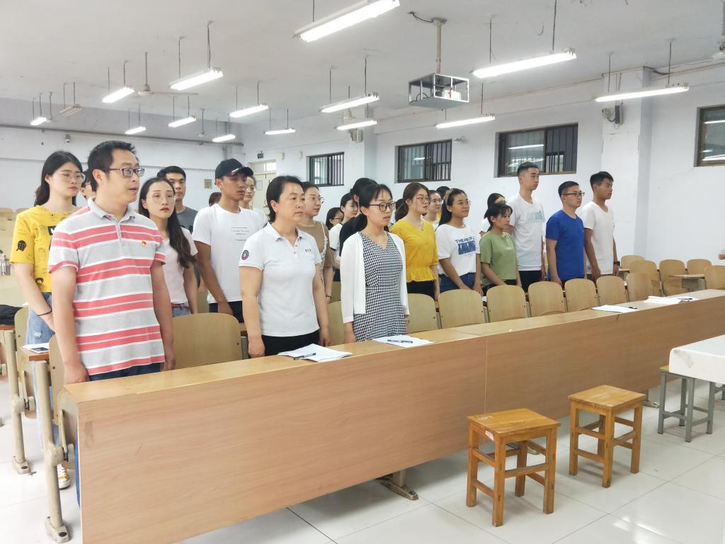 2019年6月20日下午,太阳成集团tyc9728于求实楼1011教室召开预备党员入党宣誓大会。公司党总支副书记夏书珍、辅导员周向军、郑金召参加了此次大会。2019年上半年发展的预备党员参加了此次会议。此次宣誓仪式由辅导员郑金召主持。