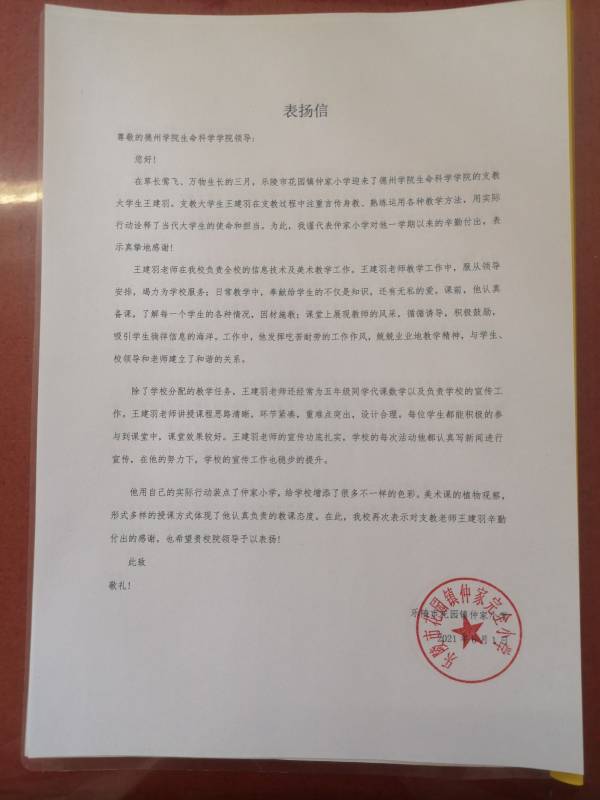 2021年6月1日,2018级生物科学本科班王建羽同学因在支教期间表现突出,受到了支教公司乐陵市花园镇仲家小学的表扬。