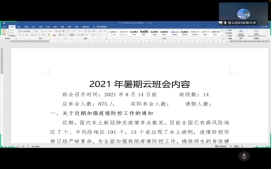 8月14日,为进一步贯彻落实公司疫情防控政策和工作要求,提高公司全体员工的疫情防控意识,引导员工做好疫情防护工作,公司各年级辅导员、班主任利用“腾讯会议”平台召开了暑期云班会。