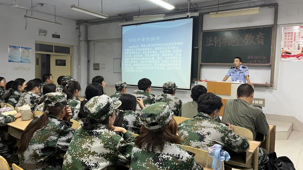 田所长首先从“法”字的含义入手,深入浅出的向大家讲解了法的起源、产生的根源、标致和规律及中国古代的历朝法律,引导新生增强法制观念,创建平安校园。随后,田所长以习近平总书记的重要指示为切入点,结合实际事例及网络电信诈骗案件特点,多角度、全方位地向新生们讲述了网络刷单、网络贷款等常见电信网络诈骗的骗术及防范技巧,提醒新生保护好个人隐私,遇到骗局做到“不理睬、不转账、不轻信、不汇款”,有效防范电信网络诈骗。