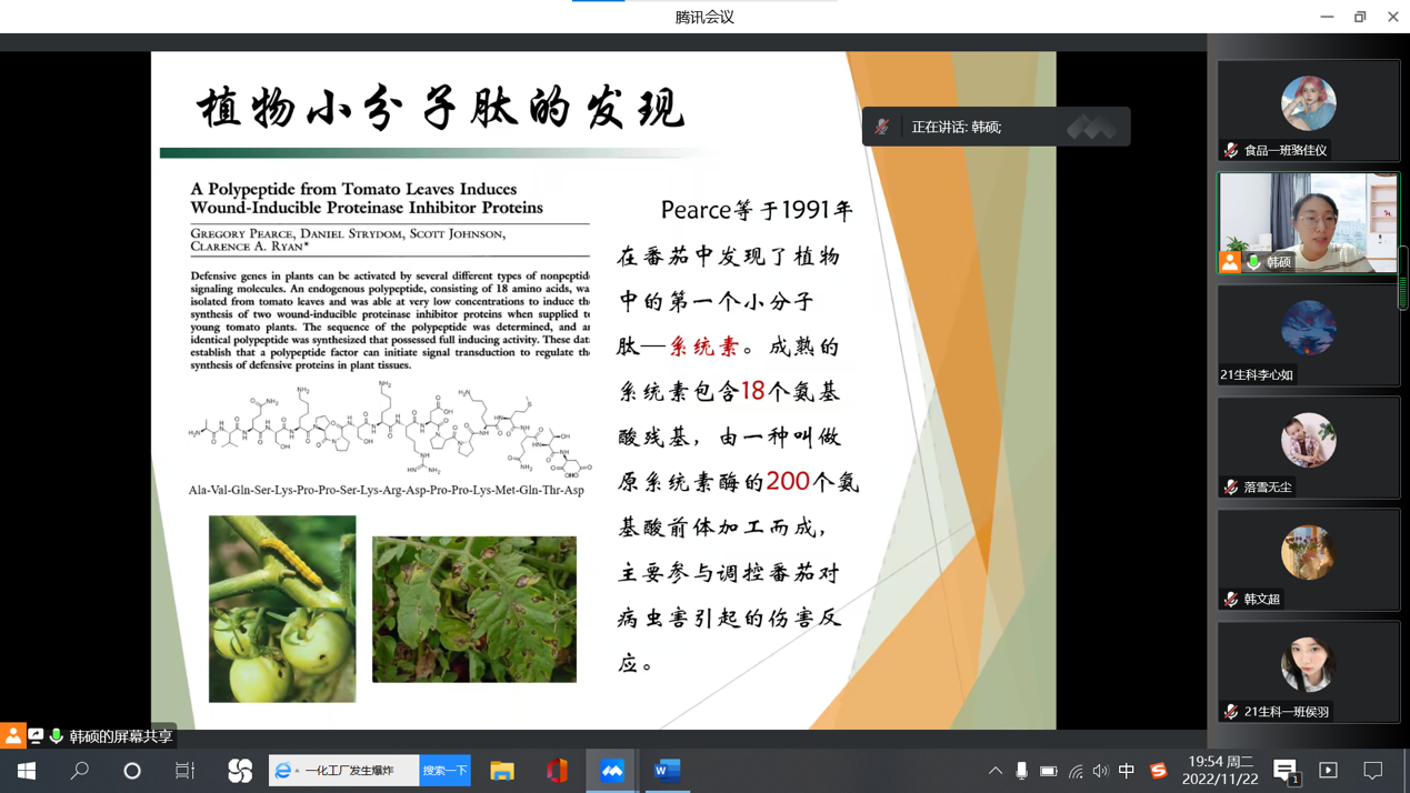 11月22日,为了进一步拓宽青少年眼界,弘扬科学精神,太阳成集团tyc9728通过腾讯会议举办线上“小分子蛋白——多肽在植物中的功能与研究”专业前沿知识讲座。