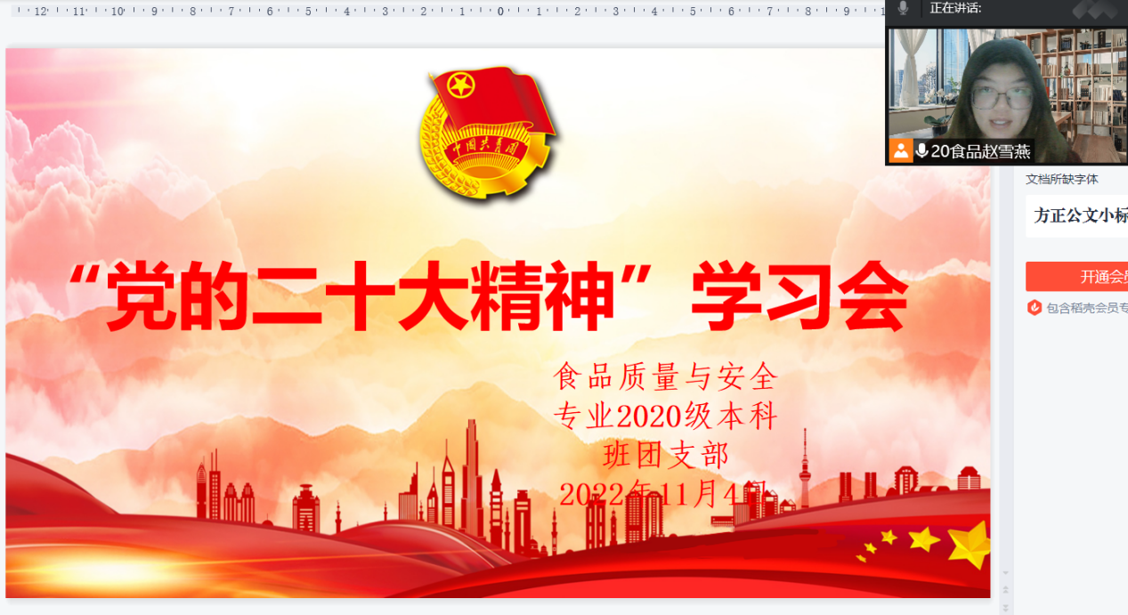 为贯彻落实习近平总书记在中国共产党第二十次全国代表大会上的重要讲话精神,太阳成集团tyc9728食品质量与安全专业2020级本科班团支部于2022年11月4日开展党的二十大精神学习会。