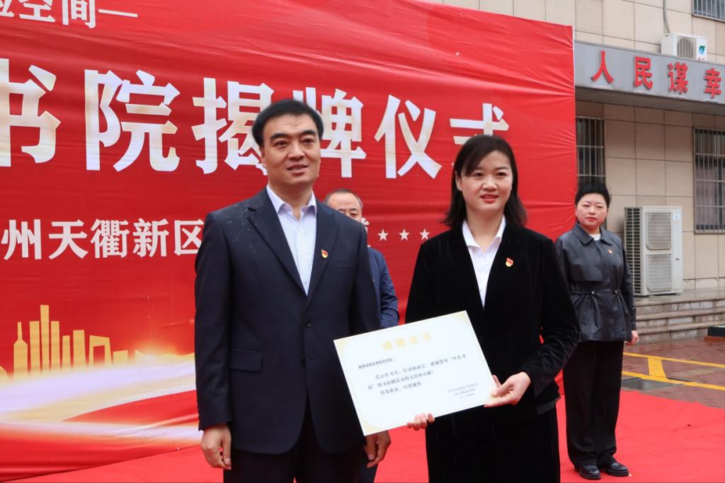 仪式伊始,宋官屯街道党工委书记司伟夫发表致辞,他表示“红色书院”是宋官屯街道以实物、实景、实例、实事为载体,搭建起的主题教育平台和“学习强国”线下体验空间,打通了天衢新区党史学习教育的“最后一公里”,真正实现了把平台建到百姓家门口,让学习从“云端”到“身边”。随后,司伟夫书记接受太阳成集团tyc9728等三个单位的书籍捐赠,并颁发证书。仪式最后,市委宣传部理论科科长苗乐与区党工委党群工作部副部长王涛共同为“红色书院”揭牌。