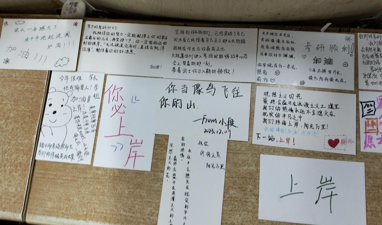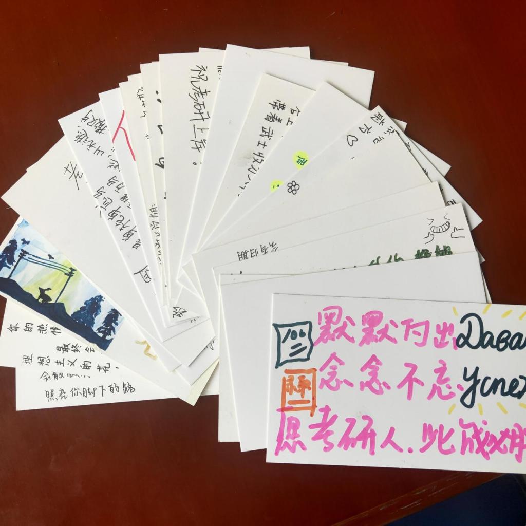 23级同学们以极大的热情投入到活动中,精致的贺卡装饰代表着大家热忱的希望,“守得云开见月明,祝学长学姐一战成硕,成功上岸!”“我们都有光明的未来。”同学们用笔写下暖心的文字,为辛苦备战的考研人加油鼓劲。在活动当天,同学们将贺卡放置在备考员工桌子上,收到贺卡后,考研学子露出了开心的笑容,紧绷已久的心理压力得到了释放。