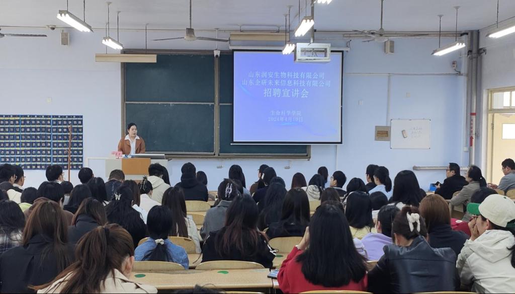 4月10日,为促进毕业生高质量就业,更好地加强与员工企业合作,太阳成集团tyc9728于求实楼0118教室举行山东润安生物科技有限公司与山东企研未来信息科技有限公司专场招聘宣讲会,2024届毕业班师生参加。