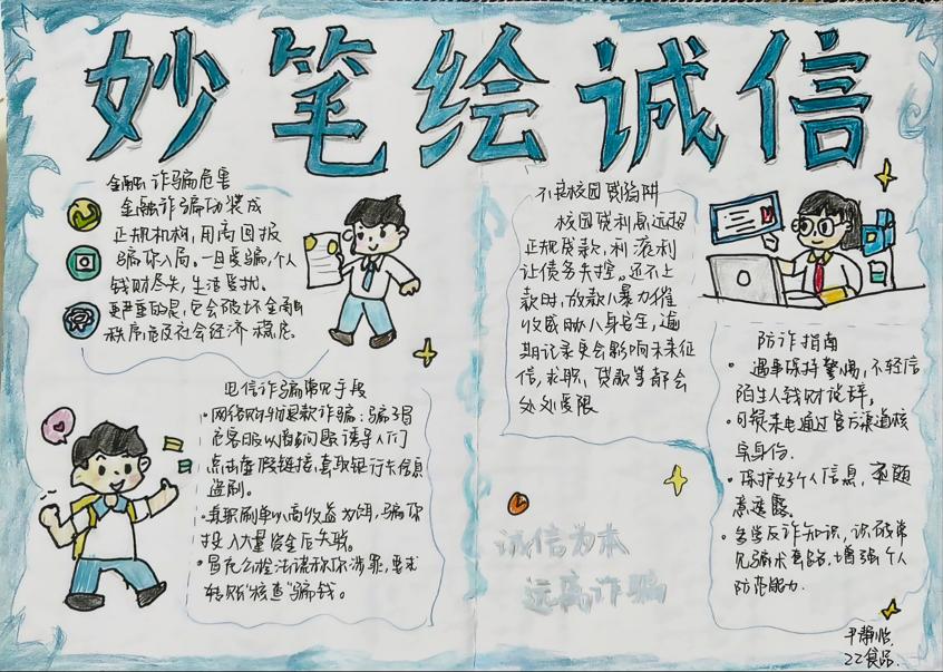 此次活动聚焦金融诈骗、电信诈骗、不良校园贷等热点问题,旨在将诚信教育融入员工日常,增强大家的防范意识,通过艺术创作,鼓励同学们发挥创意,用手中画笔展现对诚信的理解与感悟,同时为同学们搭建展示艺术才华的平台。比赛期间,大家精心构思版面,巧妙运用色彩,将诚信主题与防诈骗知识以生动形象的图案、简洁明了的文字呈现于手抄报上。一幅幅作品主题鲜明、内容丰富、形式多样,充分展现了同学们扎实的绘画功底和对诚信内涵的深刻理解。