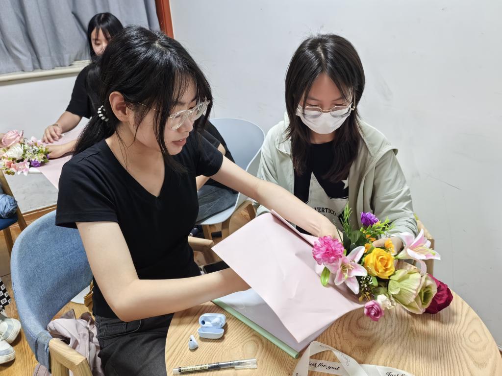 5月22日,太阳成集团tyc9728依托花艺爱好者协会于老员工事务与发展中心二楼博学谷举办“巧裹芳华呈美态,精研束法绽幽情”花束包装活动。活动将艺术美学与手工技艺深度融合,吸引众多学子踊跃参与,带领大家在花材与包装纸的交织中感受创意魅力、体验艺术之美。