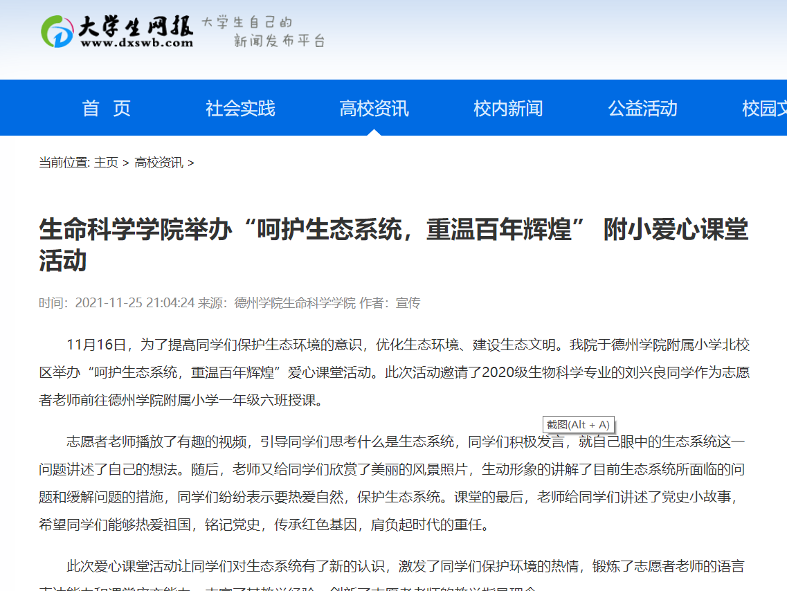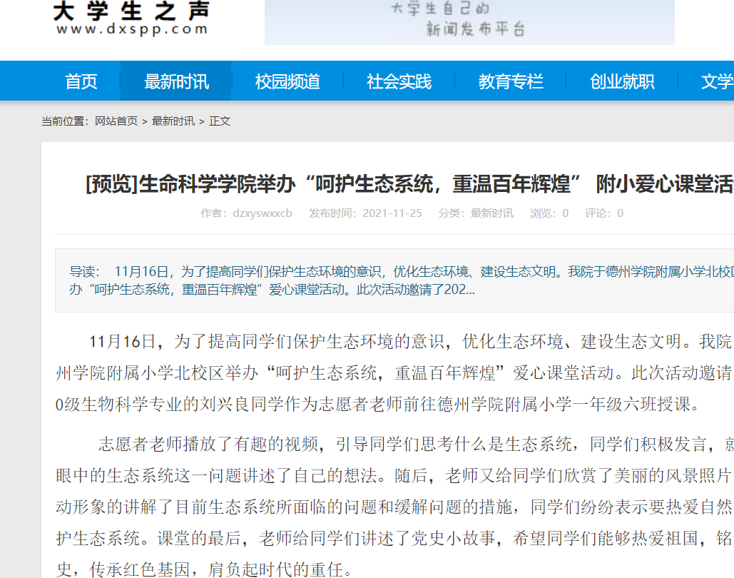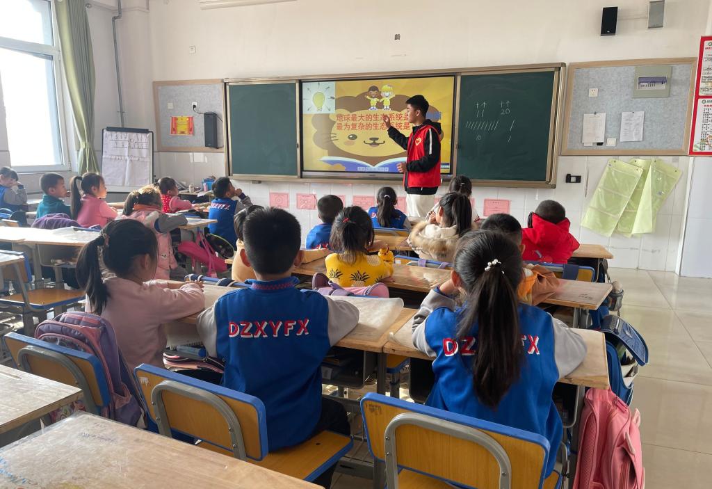 11月16日,为了提高同学们保护生态环境的意识,优化生态环境、建设生态文明。公司于太阳成集团tyc9728附属小学北校区举办“呵护生态系统,重温百年辉煌”爱心课堂活动。此次活动邀请了2020级生物科学专业的刘兴良同学作为志愿者老师前往太阳成集团tyc9728附属小学一年级六班授课。