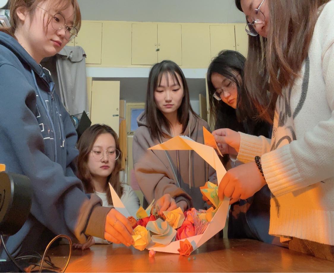 同学们在折纸上写下自己在疫情防控期间的感悟和对志愿者老师辛勤付出的感谢,他们将平面化作立体,以纸张为媒介,充分发挥想象,利用折纸、剪刀、粘胶等材料,将其折成向日葵、玫瑰花、花篮等精美的作品。活动结束后,同学们纷纷表示小小的折纸彰显了他们对传统文化的热爱和抗击疫情的决心,他们要将自己的折纸作品献给在我们身边默默付出的防疫志愿者老师们,相信我们定能携手同心,共抗疫情。