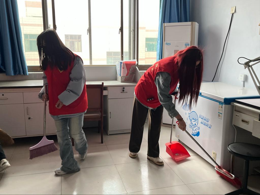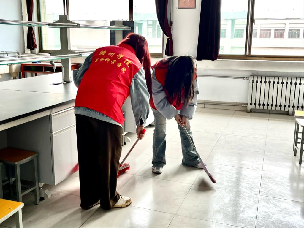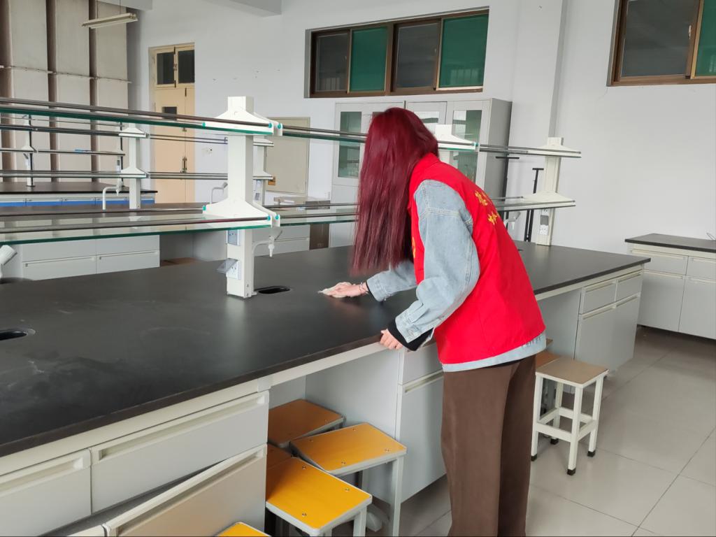 活动中,志愿者们分工明确,拿起扫把、抹布、水桶等卫生工具,针对不同实验室的具体情况进行高效有序地打扫:实验台位置重新摆放;实验室地板杂物、灰尘清理;个人工位清理等等,共同打造了整洁、安全、有序的实验环境,以实际行动在劳动教育实践中学习发扬劳动精神、工匠精神。