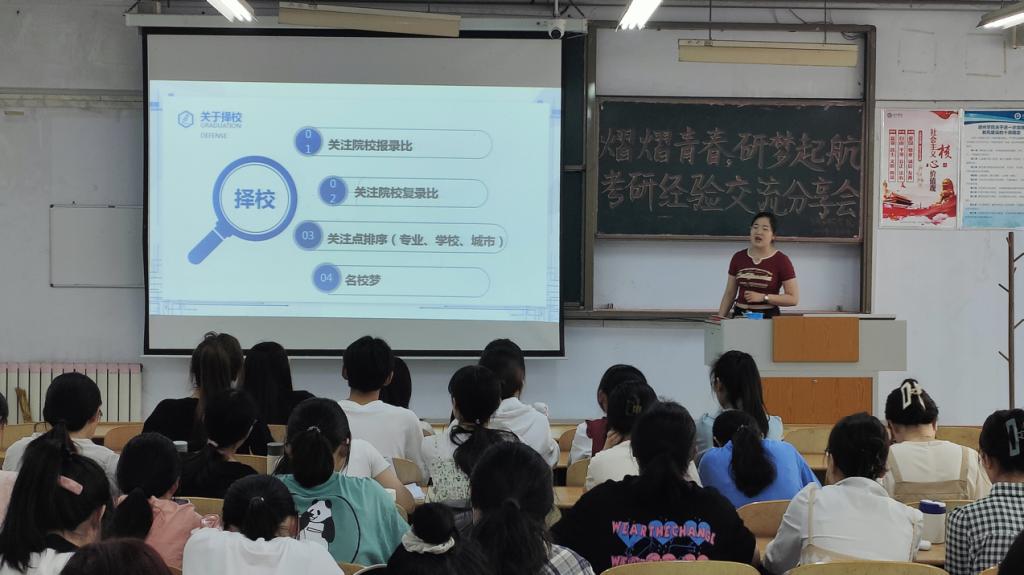 分享会上,四位考研优秀代表结合自身考研经历,从院校选择、考研计划制定、备考资料选择、复习时间安排以及复习方法推荐等方面提出合理的备考建议,并对专业课、英语及政治等科目进行了学习经验分享,她们勉励同学们树立信心,结合自己的兴趣和实力选择报考院校及专业,持之以恒地做好课程复习,安心备考、全力冲刺。在交流互动环节,优秀考研代表们对同学们关于考研的各种疑问与不解作出了详细解答,从目标选择、时间规划、考研复试等方面进行了全方位细致剖析。