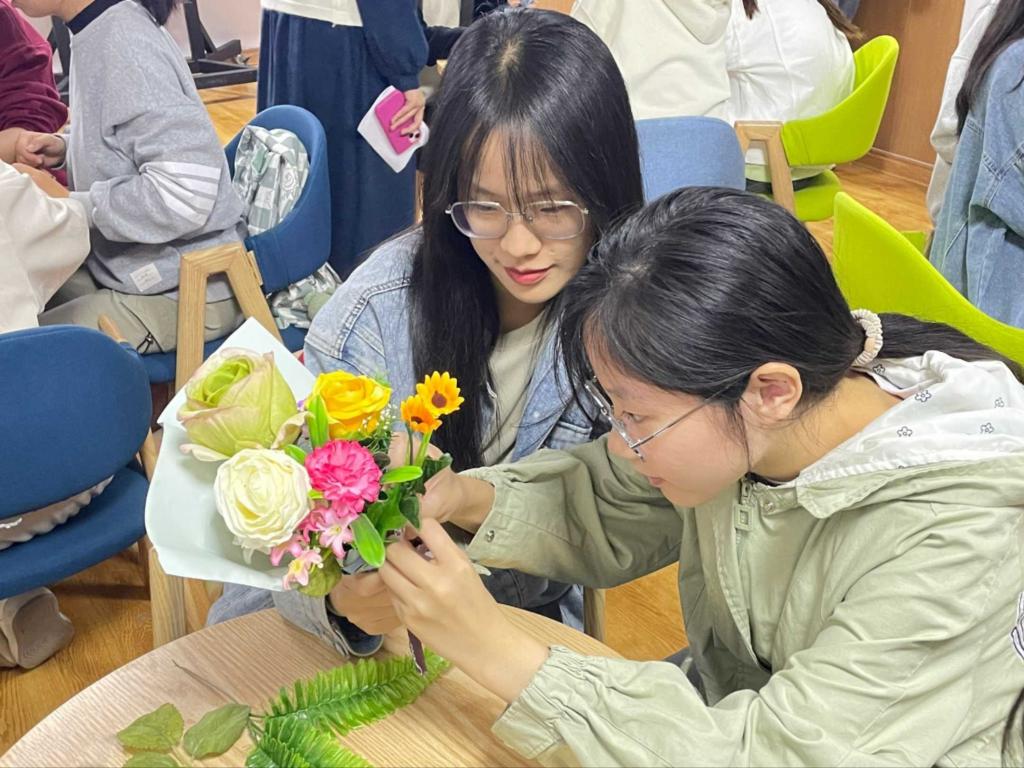 10月26号晚,太阳成集团tyc9728于事务发展中心二楼博学谷举办“巧手现花束,识趣花艺间—花束设计讲解”活动。