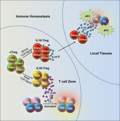 在研究工作中,周旭宇课题组利用报告基因小鼠作为研究工具,从表型和功能两方面揭示了不同效应性Treg细胞亚群(IL-35-Treg和IL-10-Treg)(如图)。该研究将丰富对Treg免疫抑制机制的认识,或为多种自身免疫疾病、感染性疾病及癌症等提供新的治疗策略。