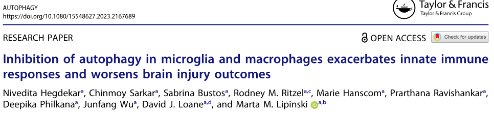 近日,来自马里兰大学医公司的研究者们在AUTOPHAGY杂志上发表了题为“Inhibition of autophagy in microglia and macrophages exacerbates innate immune responses and worsens brain injury outcomes”的文章,该研究工作表明,抑制小胶质细胞和浸润性巨噬细胞的自噬有助于脑损伤后过度的神经炎症,从长远来看,可能会阻止炎症的消退和组织再生。