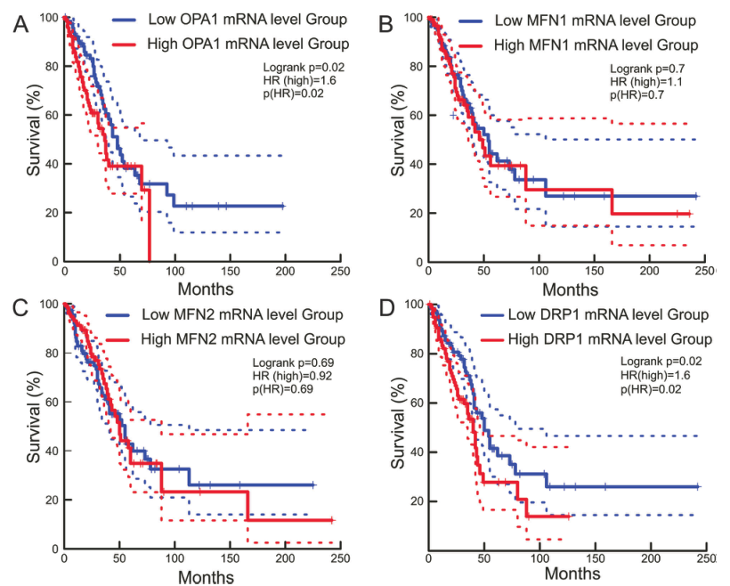 高OPA1和DRP1 mRNA水平的肺腺癌患者接受化疗后预后较差。