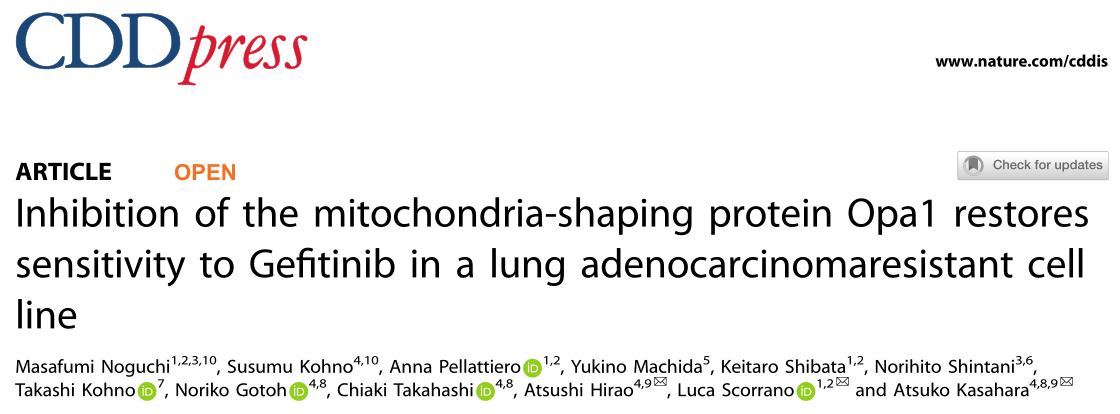 Masafumi Noguch et al. Inhibition of the mitochondria-shaping protein Opa1 restores sensitivity to Gefitinib in a lung adenocarcinomaresistant cell line. Cell Death Dis. 2023 Apr 5;14(4):241. doi: 10.1038/s41419-023-05768-2.