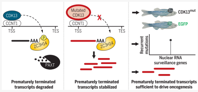 CDK13突变在很多人类癌症中都存在,且在斑马鱼、小鼠和人类细胞中的功能相同,研究人员在患者的黑色素瘤组织中观察到了突变的CDK13,并在斑马鱼研究中观察到了其会加速黑色素瘤的生长。此外,研究人员还发现了涉及PAXT复合体的CDK13突变的其它意义,其或许是细胞核RNA降解的第一个步骤。研究者Insco解释道,其或许能作为一种标记机制,但如果CDK13发生突变的话,PAXT复合体就不会被激活,其就好像开关一样能开启或关闭“吸尘器”。