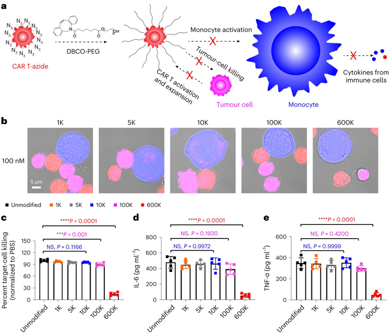 经过PEG修饰的CAR-T细胞改变细胞间相互作用和细胞因子释放。图片来自Nature Materials, 2023, doi:10.1038/s41563-023-01646-6。