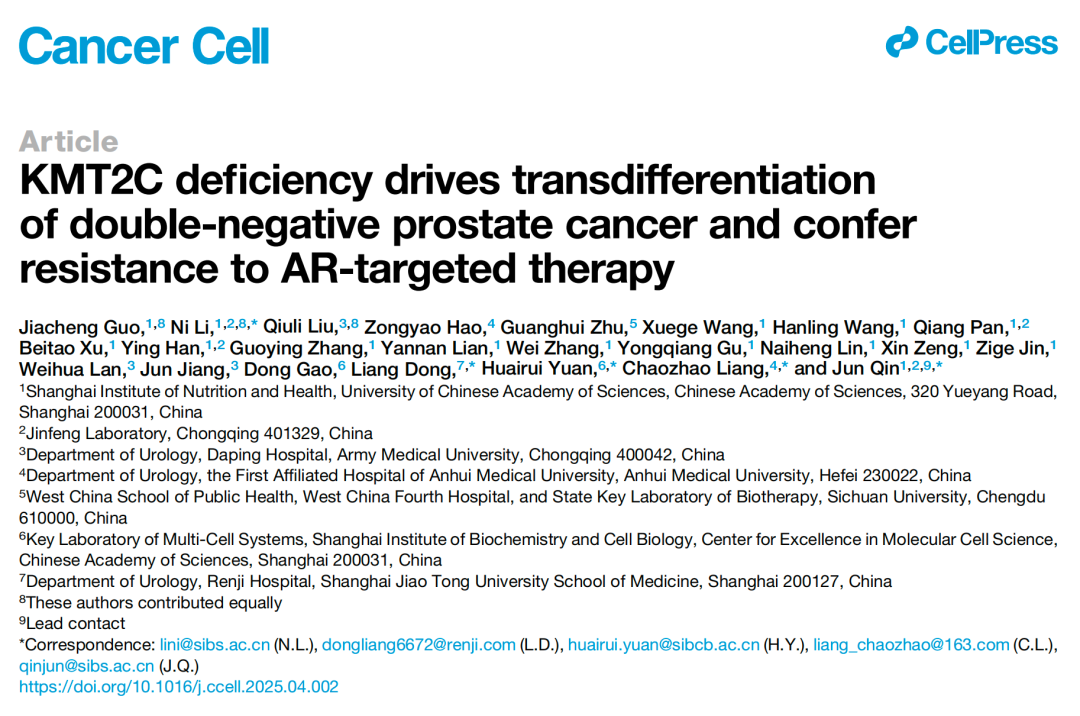 中科院上海营养与健康研究所秦骏、安徽医科大学梁朝朝、中国科公司分子细胞科学卓越创新中心袁怀瑞、上海交通大学医公司附属仁济医院董樑等人在 Cell 子刊 Cancer Cell 上发表了题为:KMT2C deficiency drives transdifferentiation of double-negative prostate cancer and confer resistance to AR-targeted therapy 的研究论文。