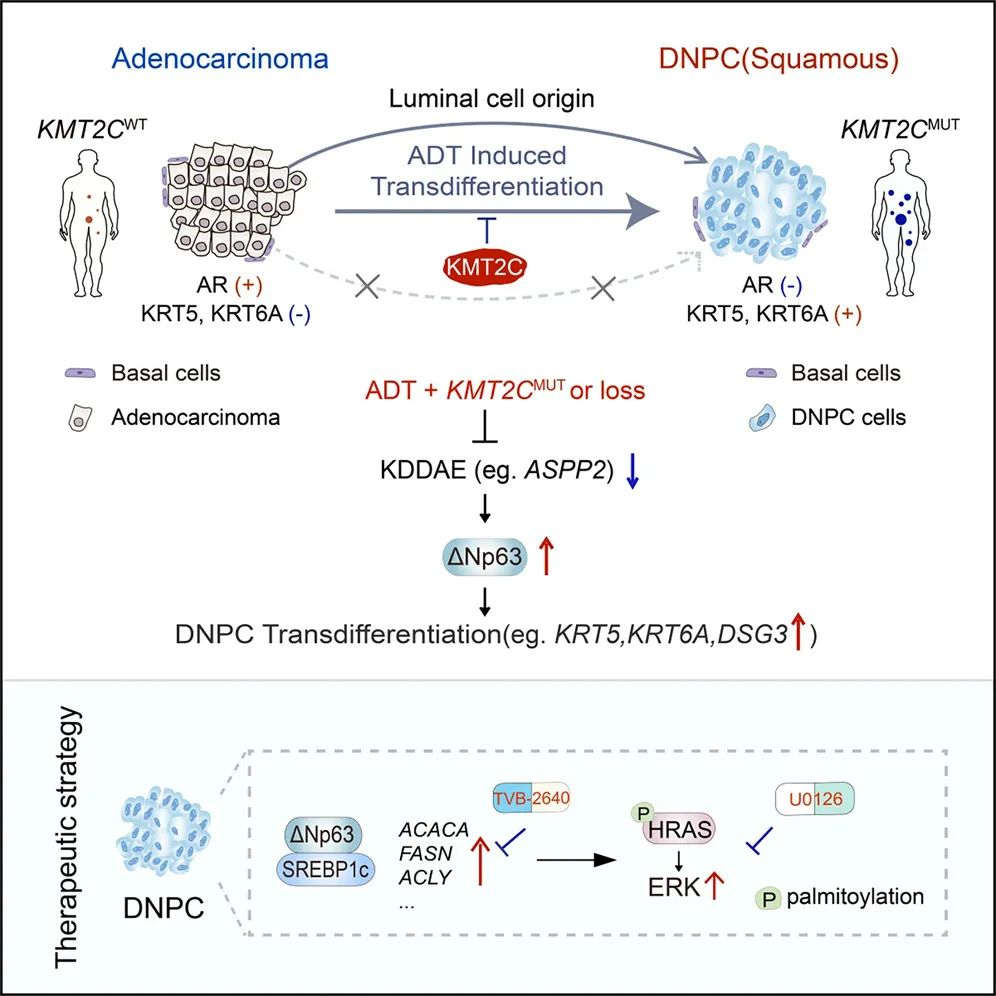 该研究表明,KMT2C 的缺失促使双阴性前列腺癌(DNPC)的转分化并赋予其对雄激素受体(AR)靶向治疗的耐药性。