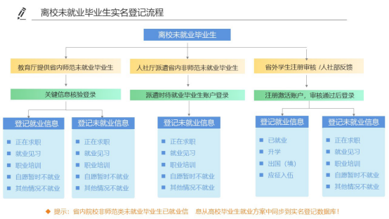 2.就业情况实名登记。离校未就业毕业生协议就业、劳动合同就业、升学、出国、入伍等其他去向功能操作和业务流程与离校前一致。