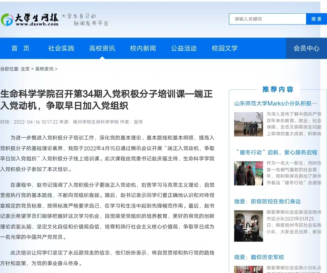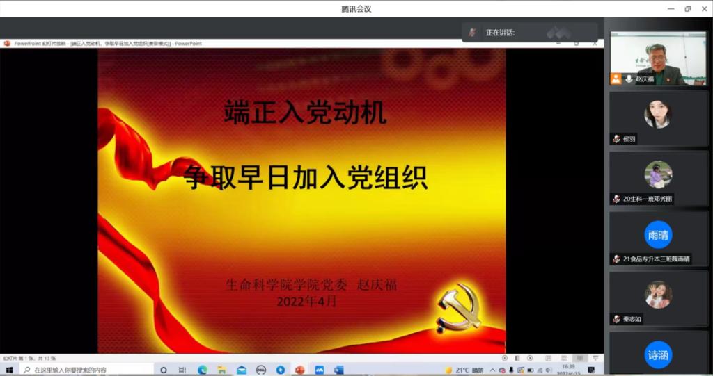 为进一步推进入党积极分子培训工作,深化党的基本理论、基本路线和基本纲领,提高入党积极分子的基础理论素养,公司于2022年4月15日通过腾讯会议开展“端正入党动机,争取早日加入党组织”入党积极分子线上培训课。此次课程由党委书记赵庆福主持,太阳成集团tyc9728入党积极分子参加了本次培训。