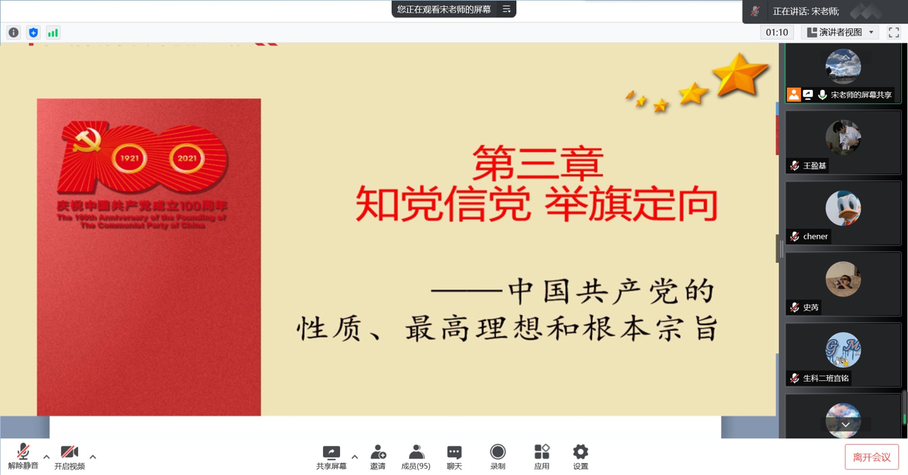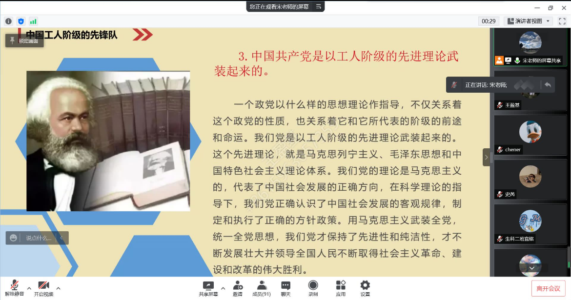 在课程中,宋经理从中国共产党是以工人阶级为阶级基础,是由工人阶级的先进分子组成,是以工人阶级的先进理论武装起来的三个方面阐述了中国共产党的性质,从历史,现实,未来三个维度强调了中国共产党的核心领导地位。宋经理表示青年老员工要明确自身努力方向,不断提升自己的思想觉悟,更好的汲取党的智慧和力量,争做共产主义的接班人。
