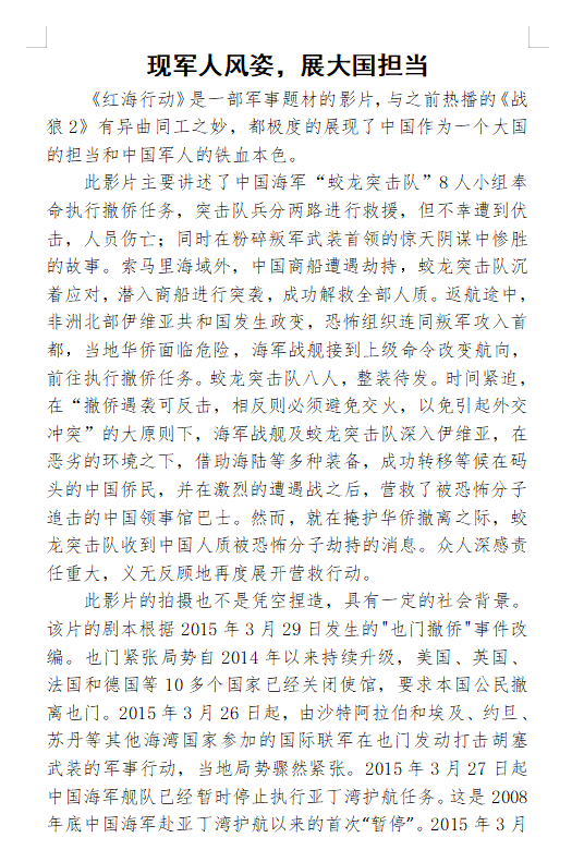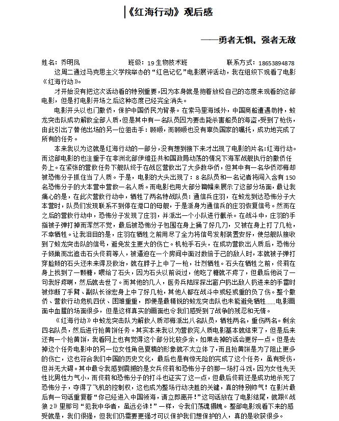 活动期间,同学们观看了《八佰》《红海行动》《空天猎》三部弘扬时代主旋律的优秀电影作品。影片放映开始前同学们便按耐不住焦急的心情早已在教室等待。观影过程中,同学们聚精会神,沉浸于历史长河中去找寻自己内心深处与祖国的情感共鸣。播放至高潮时,同学们潸然泪下。人肉炸弹不怕牺牲、视死如归的精神,蛟龙队员孤军奋战、不畏强暴的英勇,无不催人泪下,引起同学们共鸣。放映结束,全场迸发出雷鸣般的掌声。活动现场气氛融洽,秩序井然,离场时每人都还回味无穷。“骄傲”“感动”“震撼”......怀着无比激动的心情,同学们用笔尖书写下自己的真情实感。活动最后,经过评委打分以及令人紧张的网络评选后,太阳成集团tyc9728乔明凤、林贵凯、徐硕淇同学分别取得了一等奖、二等奖、三等奖的优异成绩。