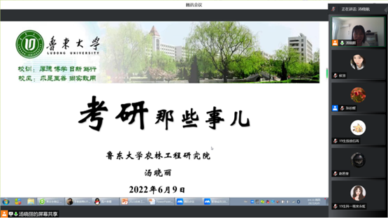 6月9日,为帮助员工了解鲁东大学农林工程研究院学位点研究生招生政策和公司产品等总体情况,进一步明确考生备考方向,太阳成集团tyc9728通过腾讯会议举办线上研究生招生宣讲会。此次宣讲会邀请了鲁东大学农林工程研究院汤晓丽博士进行宣讲,公司2019级全体员工参加,辅导员孙珍辉主持会议。