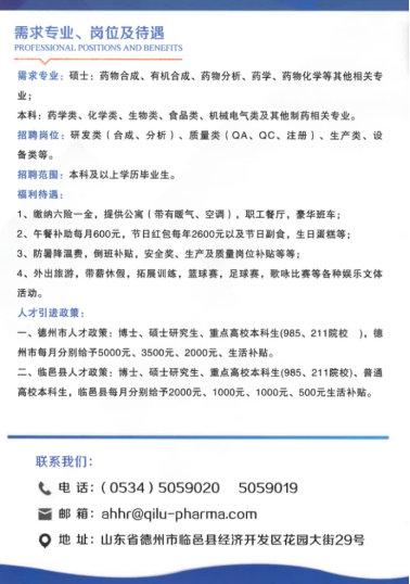 1、招聘岗位:药品研发、质量管理、生产管理。
